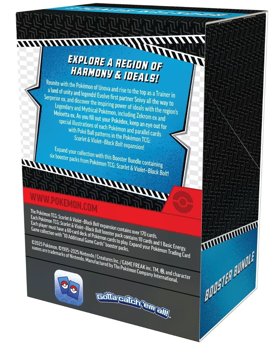 Reunite with the Pokémon of Unova and rise to the top as a Trainer in a land of unity and legends! Evolve first partner Snivy all the way to Serperior ex, and discover the inspiring power of ideals with the region’s Legendary and Mythical Pokémon, including Zekrom ex and Meloetta ex. As you fill out your Pokédex, keep an eye out for special illustrations of each Pokémon and parallel cards with Poké Ball patterns in the Pokémon TCG: Scarlet & Violet—Black Bolt expansion!